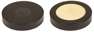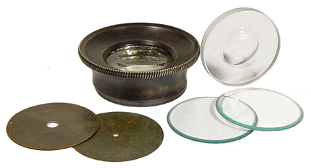 En plus du matériel classique de dissection, scalpel, aiguilles emmanchées (nous n'en avons trouvé qu'une sur deux), pince fine, des accessoires moins courants accompagnent le microscope. D'abord une cellule d'observation d'animalcules utilisable en compresseur avec ses verres plans et à concavité et ses diaphragmes minces en cuivre. Puis la "dame", en ébène et ivoire, qui se pose sur la platine porte-objet pour l'observation des corps opaques : on choisit l'une ou l'autre des faces pour faire opposition à la couleur de l'objet étudié. |