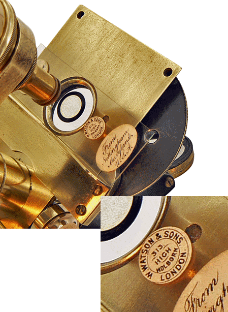 L'objectif est en deux parties dont une bonnette, actuellement posée sur la platine, qui peut recouvrir la partie principale et augmenter le grossissement. La platine est munie d'une butée à glissière qui permet de guider la préparation. L'éclairage est assuré par un miroir concave parfaitement mobile, et un diaphragme à disque. La mise au point s'effectue par système de pignon et crémaillère sur la colonne à section triangulaire. |