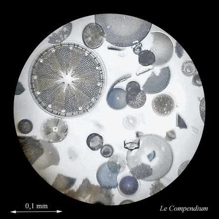 Observée à travers l'optique du microscope, une lame de Diatomées fossiles du Maryland signée Watson & Sons. Le diamètre de l'Actinoptychus, en haut et à gauche, est voisin de 0,15 mm. |
