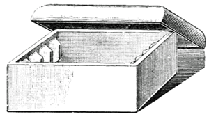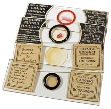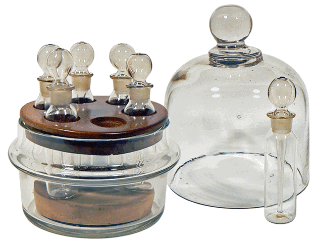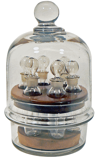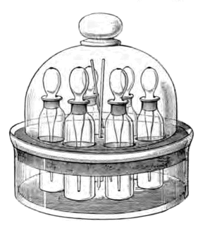 Une petite cloche en verre protège six flacons compte-gouttes à bouchon rodé positionnés sur un support en noyer. Les flacons de faible contenance (10 ml) contiennent des réactifs les plus utilisés pour traiter certaines zones de la préparation microscopique afin d'assurer des bonnes conditions d'observation au microscope.