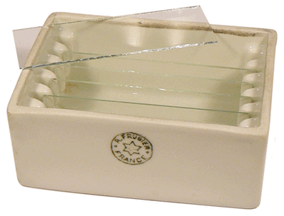 Pour certaines opérations de coloration ou de fixation, les lames sont immergées dans une cuvette à rainures contenant le réactif approprié.