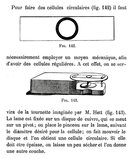 Lorsque l'on réalise une préparation microscopique, il est parfois nécessaire de délimiter la zone dans laquelle doit être contenu le spécimen à présenter. On réalise alors une "cellule" pour laquelle Arthur Chevalier - dans son TRAITÉ THÉORIQUE ET PRATIQUE DU MICROSCOPE de 1882 - préconise "la mixtion des doreurs, unie à une dissolution à base de bitume de Judée dans l'essence de thérébenthine" appliquée sur la lame porte-objet à l'aide d'un pinceau fin. L'appareil est également utilisé pour  luter la préparation c'est à dire déposer un verni de fixation sur le pourtour de la lamelle couvre-objet qui protège le specimen.