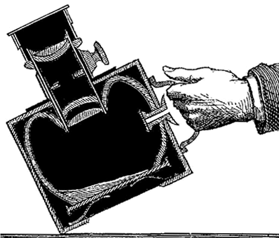 Le dessin de droite, tiré des MERVEILLES DE LA SCIENCE de Louis FIGUIER (tome 3 de 1869), montre la manière de répandre les différentes solutions sur la plaque en verre, après les avoir introduites, à l'aide d'une pipette en ivoire terminée par une poire en caoutchouc, par l'orifice situé sous la poignée de l'appareil. On observe, sur le même dessin, la forme de la chambre en verre à l'endroit ou s'insère l'objectif qui se trouve protégé de toute coulure.