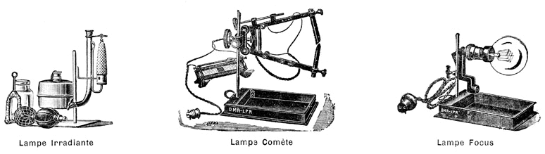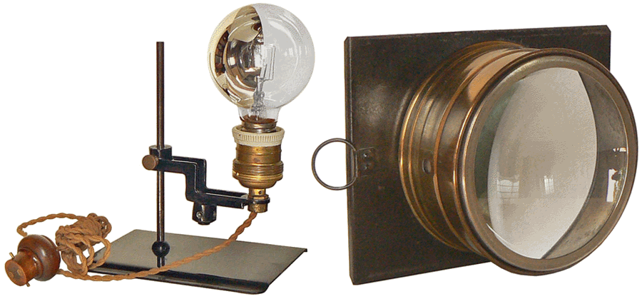 La lanterne reçoit tous les systèmes d'éclairage : alcool, gaz, électricité (éclairage par incandescence ou arc électrique), etc ... Notre modèle utilise la "Lampe Focus, avec ampoule de 100 bougies, pour courant de 110 volts continu ou alternatif, montée sur un support réglable avec raccord fil souple et prise de courant". En l'absence de l'ampoule préconisée par le constructeur, nous avons opté pour un modèle plus performant qui est, ici, monté sur le support d'origine... A droite, le condenseur de 115 mm de diamètre dans son support. |