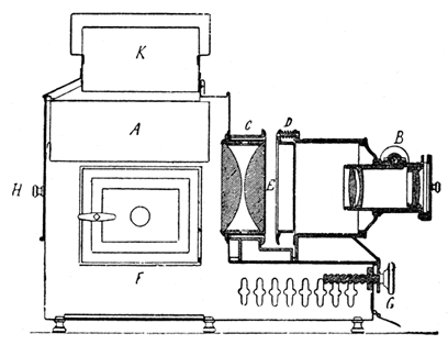 Au début du XXe siècle, de nombreux appareils de projection sont proposés aux enseignants et aux conférenciers. Notre lanterne de projection fait partie des grands appareils de ce type. Dans les années 1920, on la trouve chez DEMARIA-LAPIERRE, spécialisé dans ce domaine et probablement constructeur de l'appareil. A la même époque, elle est proposée chez divers fournisseurs de matériel pour l'enseignement et même chez Dujardin-Salleron, qui la préconise pour les conférences œnologiques... |