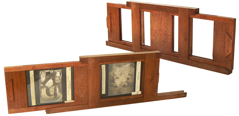 L'appareil possède un porte-châssis à ressort, mobile et indépendant et qui se place, soit contre le bâti du condenseur, soit contre la partie mobile supportant l'objectif. On peut enlever ce porte-châssis (photographie ci-dessous) et disposer à sa place divers dispositifs expérimentaux, par exemple une cuves à faces parallèles permettant de réaliser et de projeter une expérience d'électrolyse. Une plaque amovible en forme de tirette permet d'augmenter la hauteur des objets placés entre le condenseur et la partie mobile. |