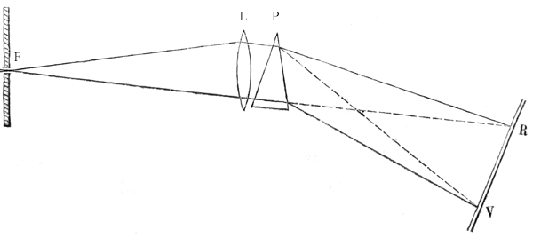 La fente F éclairée par la source de lumière à analyser joue le rôle d'objet lumineux situé au foyer principal d'une lentille interne au tube optique. A l'intérieur du tube, les rayons qui proviennent de la fente traversent la lentille L et en ressortent parallèllement entre eux pour venir frapper le prisme P qu'ils franchissent en subissant déviation et dispersion. Un réglage optimum alliant finesse de la fente et intensité lumineuse permet d'obtenir un spectre pur qui se présente comme une succession d'images de la fente. Si l'on utilise un spectroscope, le spectre est observé à travers une lunette de visée et s'il s'agit d'un spectrographe, comme c'est le cas ici, le spectre est reçu sur une plaque photographique qu'il impressionne ... |