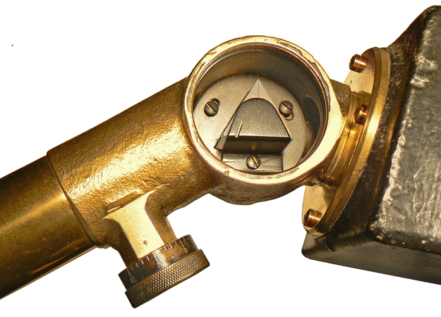 Le bouton gradué commande le déplacement de la lentille interne positionnée entre la fente et le prisme lors de la mise au point de l'image du spectre. Le prisme de Cornu utilisé pour la dispersion est constitué par deux demi-prismes en quartz droit et gauche accolés. Il permet d'obtenir un spectre couvrant l'ultra-violet et le visible, c'est-à-dire les longueurs d'onde de 185 à 800 nanomètres (1 nm = 10-9 m). Lorsque l'on utilisait cet appareil, bien avant la mise en place du système international d'unités (SI), les longueurs d'onde étaient exprimées en angstrœms (symbole Å), tels que 10 Å = 1 nm. |