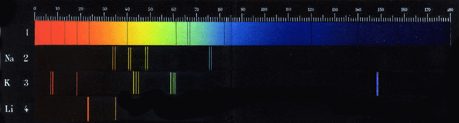 Spectre continu du Soleil - Spectres de raies du sodium, du potassium et du lithium (domaine du visible) |