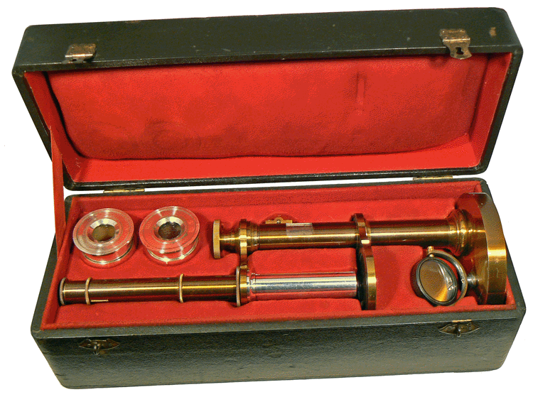 Cet appareil qui ressemble à un microscope... n'en est pas un. Il s'agit d'un spectromètre utilisé pour étudier l'absorption de certaines composantes de la lumière blanche lorsque cette dernière traverse une substance liquide. Le phénomène se traduit par l'apparition, sur l'image du spectre lumineux, de zones sombres appelées "bandes d'absorption" qui permettent souvent de déceler la présence de certains corps en solution. Il est possible, par exemple, que le "spectromètre Yvon" présenté, construit par la maison Ph. PELLIN à la fin du 19e siècle, ait été destiné à l'examen du sang afin de déceler, rapidement, la présence de composés anormaux à la suite d'un empoisonnement ou d'une asphyxie... |