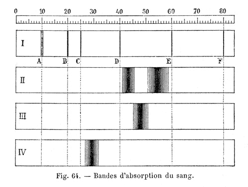 Dans son manuel à l'usage des candidats au Certificat d'Etudes Physiques, Chimiques et Naturelles, A. LEDUC présente des spectres d'absorption caractéristiques du sang en précisant la position des bandes par rapport aux raies du spectre solaire (I). Le spectre (II) correspond à l'oxyhémoglobine du sang normal. Si on ajoute un agent réducteur à ce sang, les deux bandes sont remplacées par une seule (appelée bande de Stokes), intermédiaire aux deux précédentes : on est en présence de l'hémoglobine réduite ou déxoxyhémoglobine (III). En soumettant le sang à l'action d'un acide fort, on obtient le spectre (IV) caractéristique de la méthémoglobine en solution acide... |