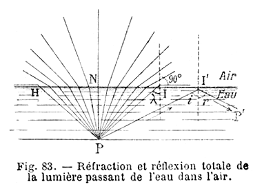 La Fig. 83 du même ouvrage montre un rayon incident issu de P et se propageant dans l'eau en direction de l'air. Pour un angle d'incidence inférieur à λ, angle limite, le rayon est réfracté en sortant dans l'air. Pour un angle égal à λ, le rayon sort en I en rasant la surface de l'eau. Pour une incidence supérieure à λ , le rayon ne peut sortir et, en I', il subit la réflexion totale suivant I'P'. |