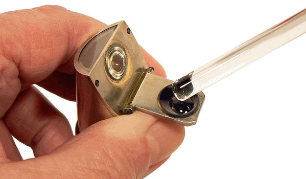 A l'aide d'un agitateur ou d'une pipette fine, on dépose une goutte du liquide à étudier dans la cupule du volet mobile. En rabattant le corps du réfractomètre sur ce volet, le liquide entre en contact avec la face plane de la lentille demi-boule. |