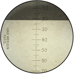 La séparation entre la zone lumineuse qui reçoit la lumière réfléchie et la zone obscure coïncide avec la division 21 du réticule. Le tableau manuscrit lié au réfractomètre donne une valeur très légèrement supérieure à 1,37 valeur de l'indice de réfraction d'une solution de glucose à 25% utilisée pour l'exemple. |