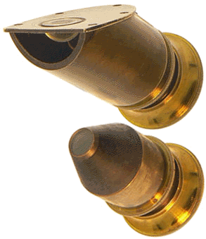 Les deux photographies ci-dessus sont celles d'un second instrument présenté en partie démonté. La première image permet de distinguer la lentille demi-boule dans sa totalité : la face plane extérieure et la face intérieure hémisphérique. La seconde image montre la pièce cylindro-conique interne qui se termine par le réticule en verre sur lequel l'opérateur met au point par tirage de l'oculaire dont on voit la colerette à droite. |