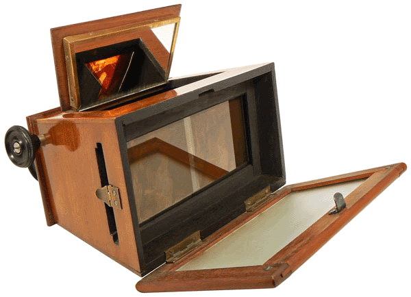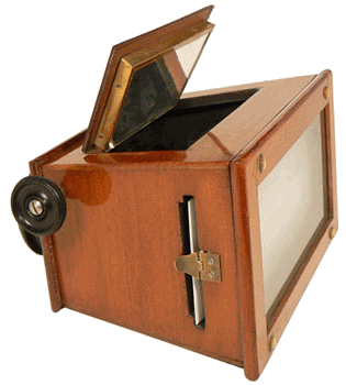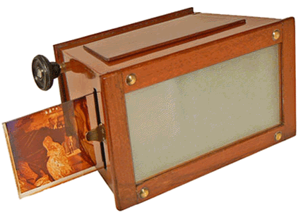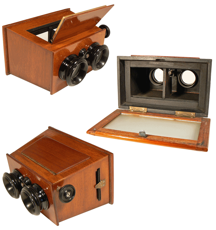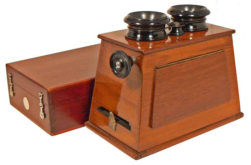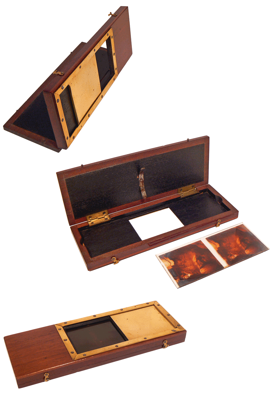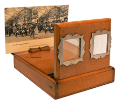 Devant un coffret de rangement des plaques d'observation, ce stéréoscope était très en vogue dans les années 1920. Il permet d'observer des vues stéréoscopiques sur support cartonné ou sur plaque de verre de format 6 x 13 cm. |