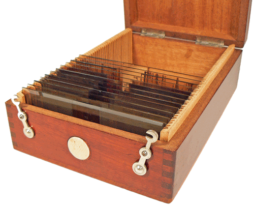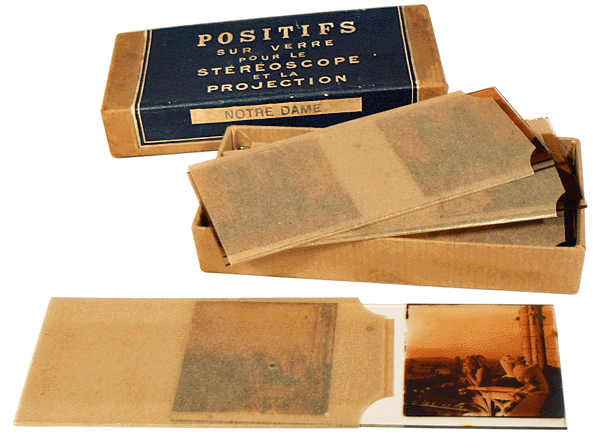 Ci-dessus, une boîte en carton contenant une série de douze "positifs" sur un même thème. Chaque plaque de verre est protégée par un étui de papier cristal. A droite, un coffret à rainures prévu pour le rangement d'une cinquantaine de vues. |