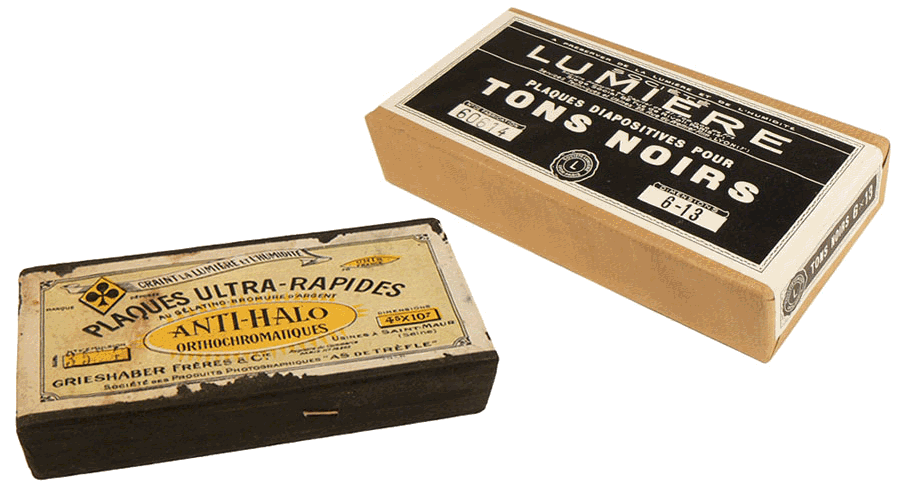 Ces deux boîtes n'ont jamais été ouvertes : chacune contient une douzaine de plaques stéréoscopiques vierges datant de la première partie du 20e siècle. Les unes, de dimensions 6 x 13 cm ont été fabriquées par la Société LUMIERE dans ses usines de Lyon et les autres, au format 4,5 x 10,7 cm, par la Société des Produits Photographiques "AS DE TRÈFLE" à Saint-Maur. Il suffit de tirer sur l'extrémité du fil visible sur le côté de la seconde boîte pour couper la bande de garantie, tout autour de la boîte. Ce que nous ne ferons pas... |