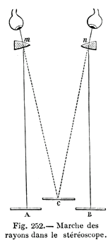 Les points de vue sont différents. L'œil gauche discerne la face gauche, le 3, tandis que l'œil droit discerne la face opposée, le 4. Le but du stéréoscope, imaginé par Wheatstone puis perfectionné par Brewster est de fusionner les deux images photographiées pour restituer à l'observateur la vision en relief d'une scène unique. |