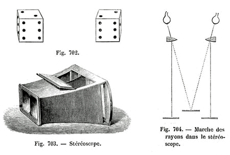 Ces dessins appartiennent au TRAITÉ ÉLÉMENTAIRE DE PHYSIQUE de A. Privat Deschanel édité en 1869 : ils accompagnent la description du stéréoscope. Sur les faces supérieures des images du même dé de la Fig. 702, on remarque une anomalie : les diagonales passant par chaque couple de points noirs formant les "2" sont symétriques l'une de l'autre, ce qui, bien sûr, ne correspond pas à la théorie de l'instrument. On retrouve la même erreur dans L'OPTIQUE de Fulgence Marion, en 1874. Il est vrai que l'auteur du traité de physique a collaboré à L'OPTIQUE et que c'est le même dessinateur qui a travaillé sur les deux ouvrages à quelques années d'intervalle... |