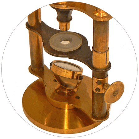 Actuellement, la platine porte un disque en verre à concavité permettant l'observation d'objets ou d'animalcules en milieu liquide. La mise au point s'effectue, dans un premier temps "par le coulant" c'est-à-dire en faisant glisser le tube optique, puis en provocant le déplacement vertical de la platine porte-objet par le jeu d'un coulisseau et d'une crémaillère situés dans une des colonnes du microscope. Ce mouvement fin est commandé par un bouton moleté solidaire d'un pignon agissant sur la crémaillère. |