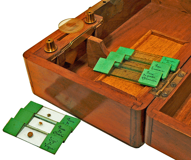 Dans le coffret, deux objectifs supplémentaires numérotés 2 et 3, la pince fine et le disque à concavité, accompagnent six préparations de 6 x 1,6 cm réalisées dans la deuxième moitié du XIXe siècle : tige de vigne, puce de chat, plume de colibri, bout de patte de hanneton, pou humain et trompe de mouche. Comme les autres préparations, celle du pou humain est réalisée entre deux lames de verre identiques. Des bandelettes de papier vert collées aux extrémités maintiennent les lames plaquées l'une contre l'autre. L'étanchéité n'est sans doute pas parfaite et l'état de conservation du spécimen est très moyen. |