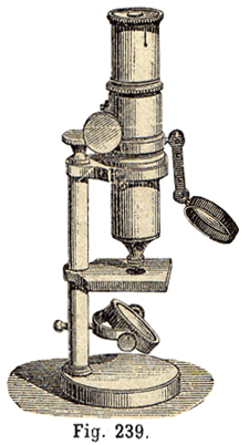 On rencontre ce microscope de fabrication française à la fin du 19e siècle. On retrouve un modèle plus petit (17cm au lieu de 21) sous le nom de "Microscope élémentaire, modèle A - fig. 239" sur le catalogue "LES FILS D'EMILE DEYROLLE" de 1924. Il est alors proposé, avec une lentille articulée pour l'éclairage des objets opaques, au prix de 125 francs.