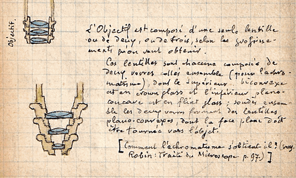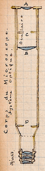 Le petit carnet a suivi un chemin différent de celui du microscope pour parvenir jusqu'à nous. Son auteur l'a commencé au début du XXe siècle (une observation commentée d'infusoire est datée du 9 octobre 1906). Il renferme une belle description de l'instrument ainsi que des conseils d'utilisation... |