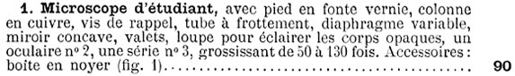En 1885, le microscope figure au CATALOGUE ILLUSTRÉ DES MICROSCOPES DE PRÉCISION POUR L'ÉTUDE DES SCIENCES NATURELLES, construits par le Docteur ARTHUR CHEVALIER. Il est, alors, vendu 90 francs. |