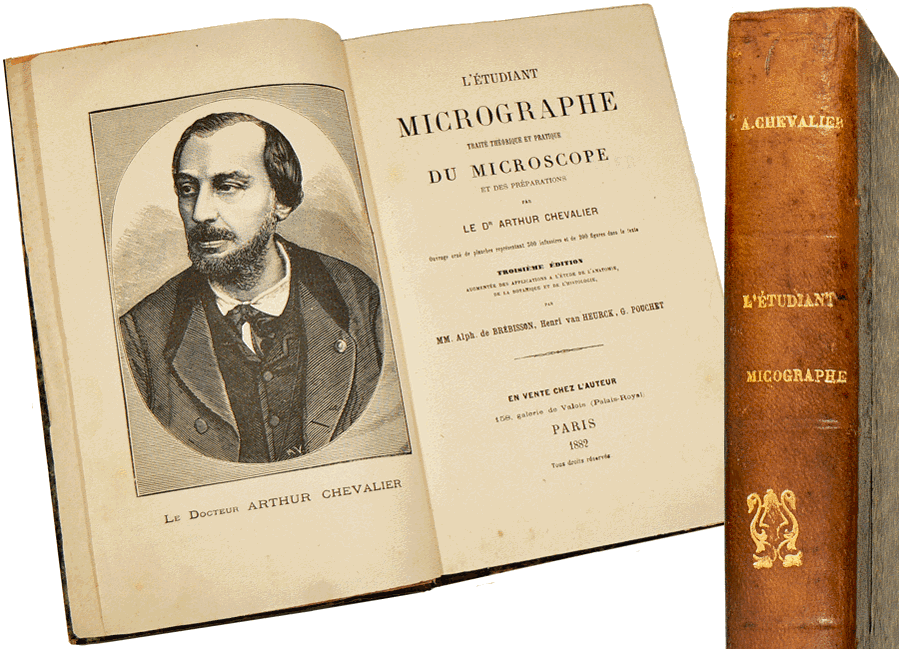 Dans son livre, L'ETUDIANT MICROGRAPHE, Arthur CHEVALIER qui a succédé à son père en 1859 pour prendre en main la destinée de la maison Chevalier, présente l'ensemble des microscopes de son catalogue. |