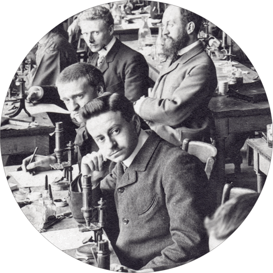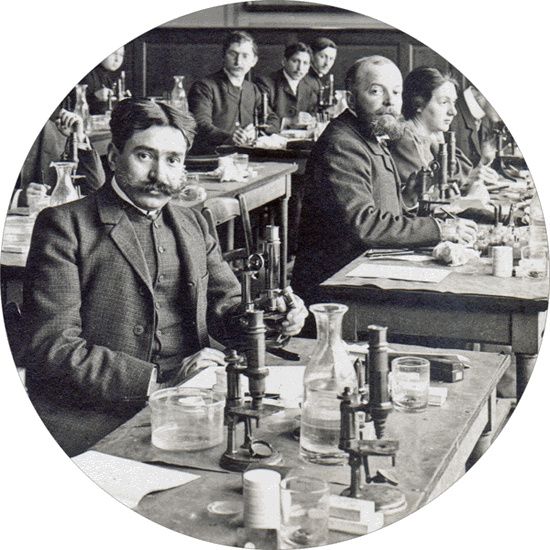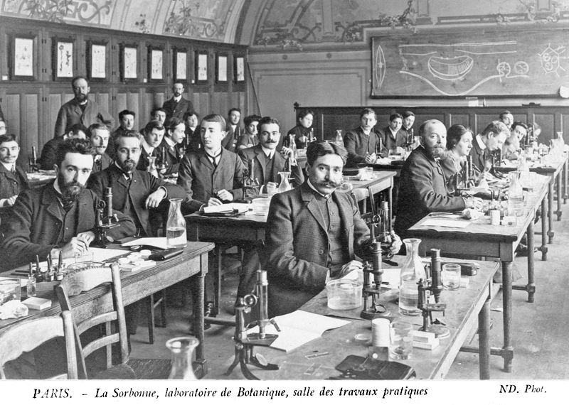 Au premier plan, sur cette photographie prise dans une salle de travaux pratiques de botanique de la Sorbonne au début du XXe siècle, les deux microscopes portent probablement la même signature que le nôtre... |