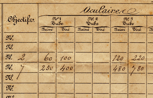 Le tableau donne les performances obtenues avec les objectifs n°2 et n°7 combinés aux oculaires n°1 et n°3 qui accompagnent le microscope. Le grossissement peut prendre différentes valeurs comprises entre 60 et 780. Les plus forts grossissements s'obtiennent le tube optique tiré au maximum. |