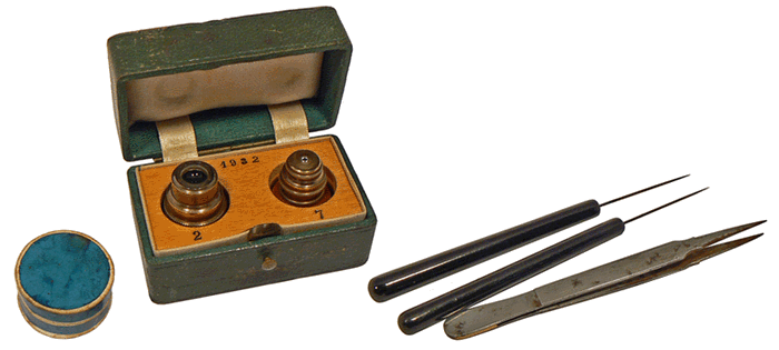 A côté de l'écrin dans lequel sont rangés les objectifs, on remarque la boîte de lamelles couvre-objet, les aiguilles droites emmanchées et la pince fine. L'ensemble appartient au coffret du microscope C. Vérick n° 1932. |
