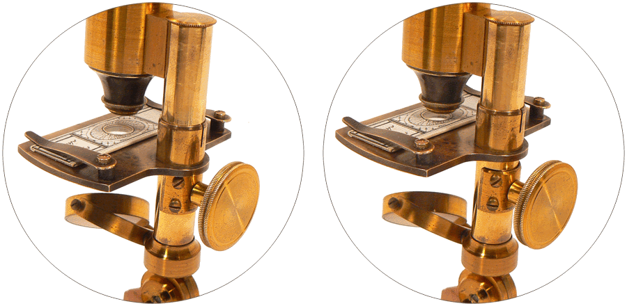 Le réglage grossier est réalisé par glissement du tube optique. La mise au point fine est obtenue en agissant sur la platine qui porte la préparation. Le déplacement vertical de la platine est commandé par un bouton moleté solidaire d'un pignon agissant, dans la colonne du microscope, sur une crémaillère reliée à cette platine. |