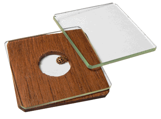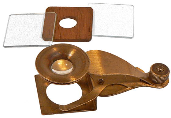 L'instrument en laiton doré a une longueur de 6,5 centimètres. Il est muni de trois petites plaquettes dont deux sont en verre, la troisième, évidée en son centre, étant en acajou. On les superpose pour former une cellule d'observation qui peut recevoir des animaux vivants de taille modeste tels les fourmis, les très petites araignées ou autres zygentomes de la famille des "poissons d'argent" et même, comme on peut le voir plus loin, une coccinelle minuscule ... |