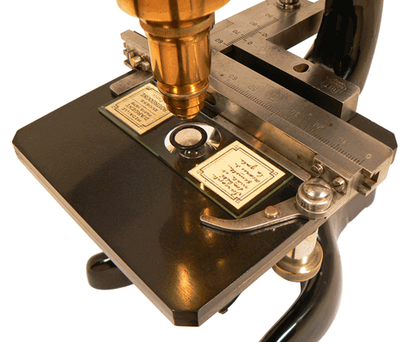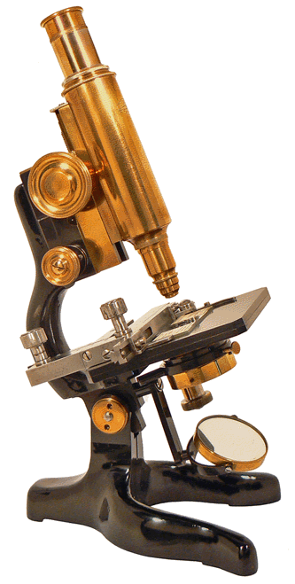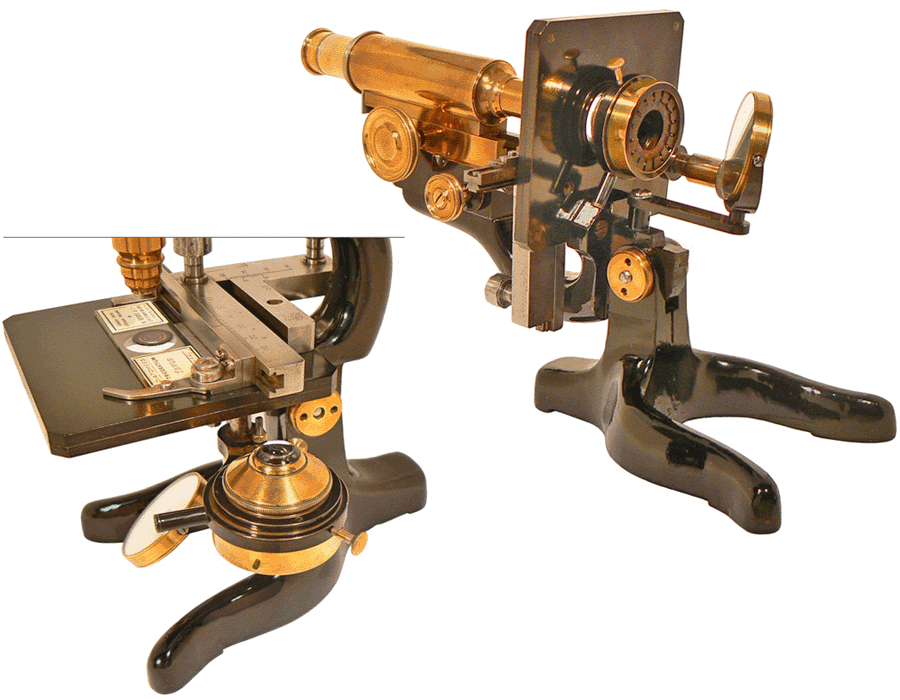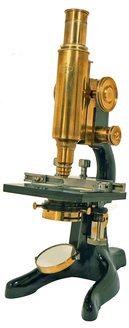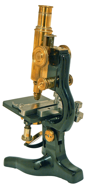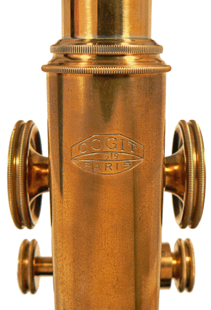 Ce microscope rappelle les modèles "stativ G" et "stativ GH" proposés, dans le premier quart du 20e siècle, par la société allemande Ernst LEITZ dont COGIT était agent et dépositaire pour la France. Son pied, lourd, donne à l'instrument une bonne stabilité et permet une inclinaison importante. Il est doté d'un système à pignon et crémaillère pour le réglage rapide et d'une vis micrométrique à tambour divisé pour la mise au point fine. |