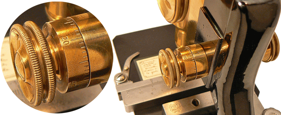 Le tambour gradué solidaire de la commande de la vis micrométrique permet de mesurer la distance entre deux niveaux d'une préparation. Le passage d'une division à la suivante devant le trait de repère (par exemple, ici, de 19 à 20) correspond à un déplacement du tube optique de 0,002 mm dans son axe. Il devient possible de mesurer assez exactement des faibles épaisseurs en mettant successivement au point sur les deux niveaux considérés. Si d représente la différence des deux lectures en nombre de divisions et n l'indice de réfraction de la substance composant l'objet observé, l'épaisseur réelle de cet objet est D = n d. |